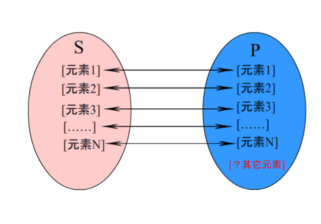 但不能倒过来说,P中的每个元素 都与 S 中的一个元素 对应。可能 P中的某些元素 跟 S 中的任何元素都不对应。