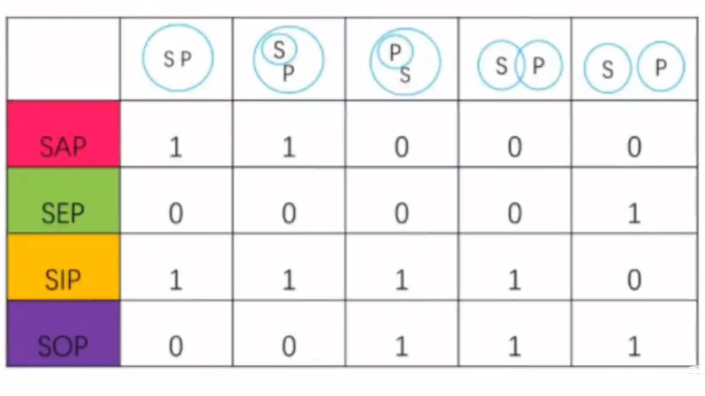 所以SIP真,并不必然代表 S 与 P 是交叉关系。如下图,它们可能是除了“全异关系”之外的任何一种关系。