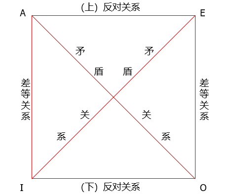 | 差等关系 | (上下参照图片) 真,从上往下看,上真则下真; 假,从下往上看,下假则上假。 | SAP真,则SIP真。 SEP真,则SOP真。 SIP假,则SAP假。 SOP假,则SEP假。 |