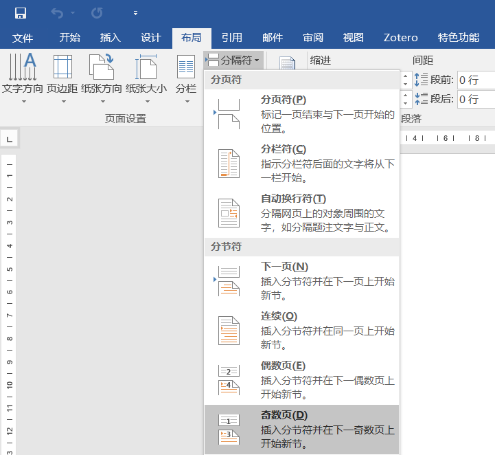 因此需要补一个 分节符(奇数页)到前一章的结尾:
