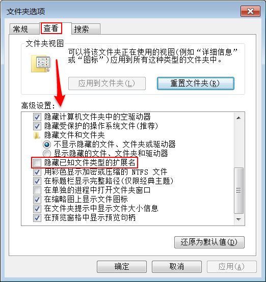 Win7 双击 打开【计算机】 【组织】→ 【文件夹和搜索选项】 【查看】选项卡→取消选中【隐藏已知文件类型的扩展名】 Win 10 从【桌面】打开【此电脑】(或者按 Win + E 键) 在【文件资源管理器】中,点击【查看】选项卡 → 选中【显示/隐藏】中的【文件扩展名】: Win 11 类似 Win 10